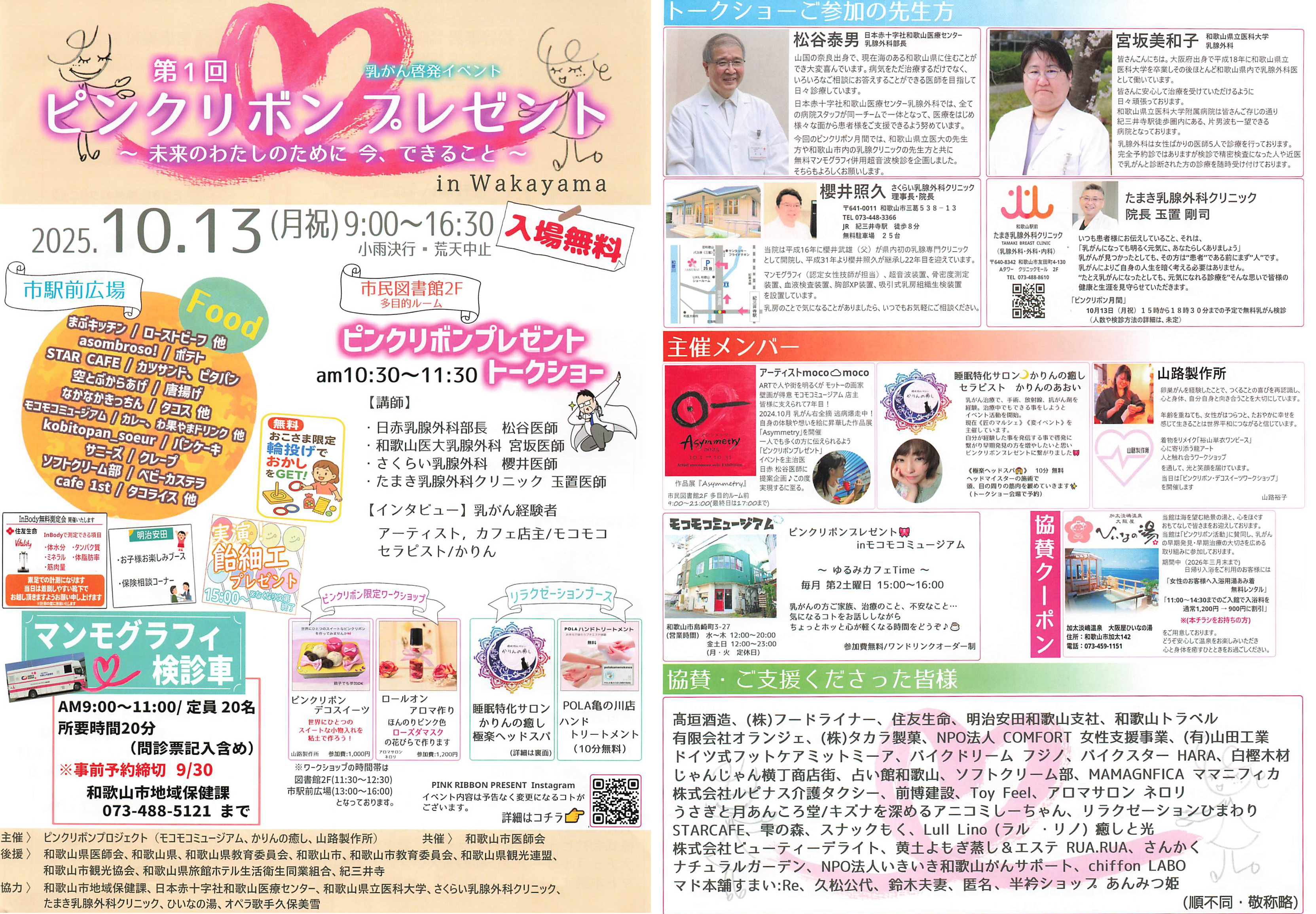 2025年10月13日(月祝)に、【乳がん啓発イベント『第1回ピンクリボンプレゼント』〜未来のわたしのために 今、できること〜 in Wakayama】が開催されます。